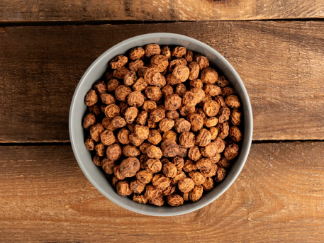 Originaire du continent africain et de méditerranée, le souchet comestible est une plante herbacée rhizomateuse vivace de la famille des Cypéracées. Aussi appelé « amande de terre », « noix tigrée » ou « pois sucré », le souchet n’est en réalité pas une noix, mais un tubercule racine aux nombreuses qualités nutritionnelles. Ne faisant pas partie de la famille des oléagineux, le souchet est un produit non allergène et naturellement sans gluten ni lactose. Ses tubercules ont un goût légèrement doux, avec des notes de noisettes.